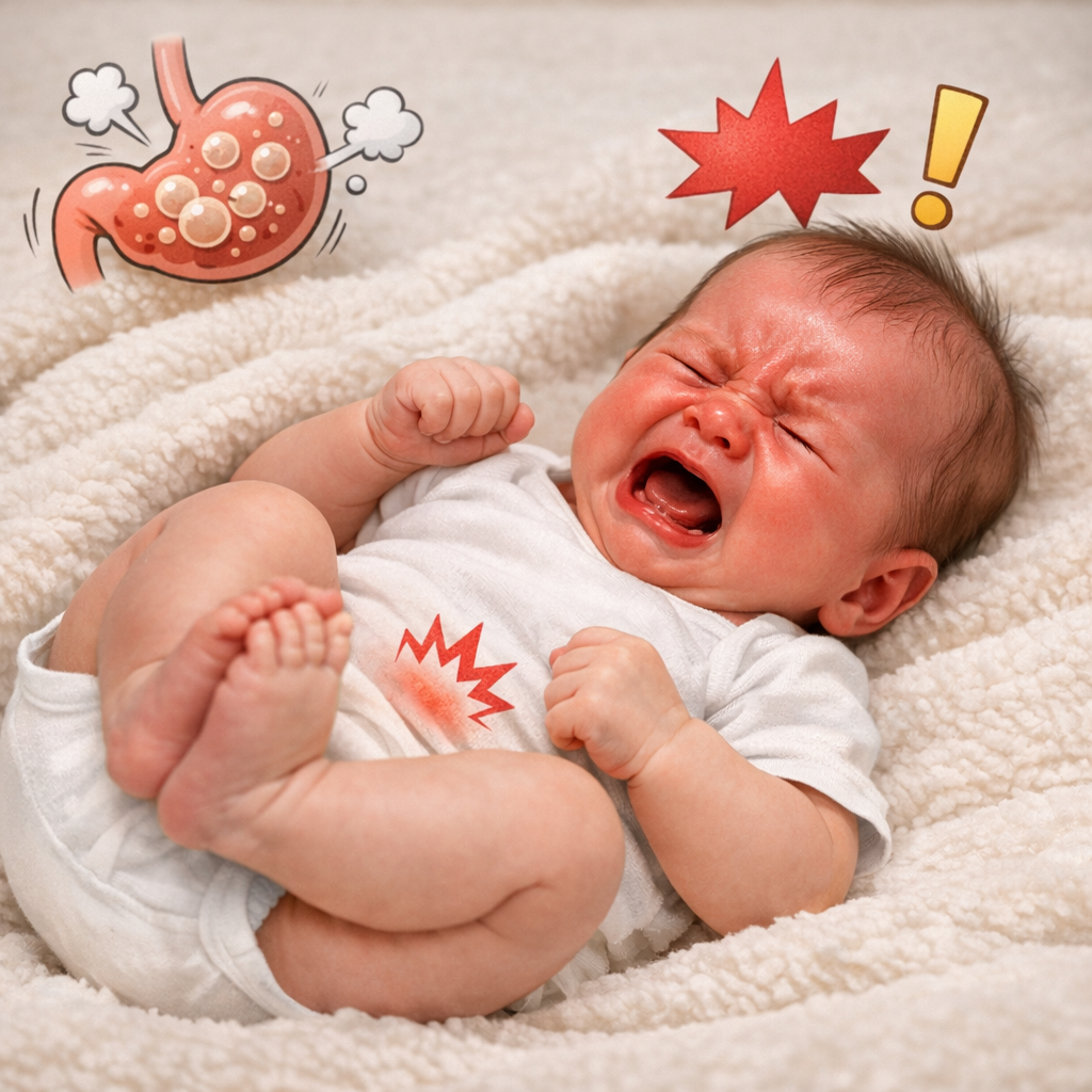 얼굴이 붉어질 정도로 강하게 울음 주먹을 꽉 쥐고 몸에 힘을 줌 다리를 배 쪽으로 끌어당김 배가 단단하게 팽창 쉽게 달래지지 않음 이러한 증상은 일정 시간 지속되다가 갑자기 멈추는 경우도 많습니다.